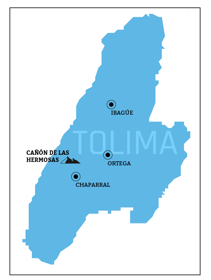 Letreros con calaveras rojas anuncian que el carro se acerca al pie de la montaña. Peligro de minas, advierten. Otros letreros piden tener cuidado con las dantas y animales endémicos de la zona. “Déjalo pasar, déjalo vivir”, se lee. El jeep avanza unos 40 minutos entre fango, charcos y piedras desde Chaparral. La última carretera pavimentada quedó atrás en ese pueblo, ubicado unos 137 kilómetros al sur de la capital del Tolima, Ibagué.