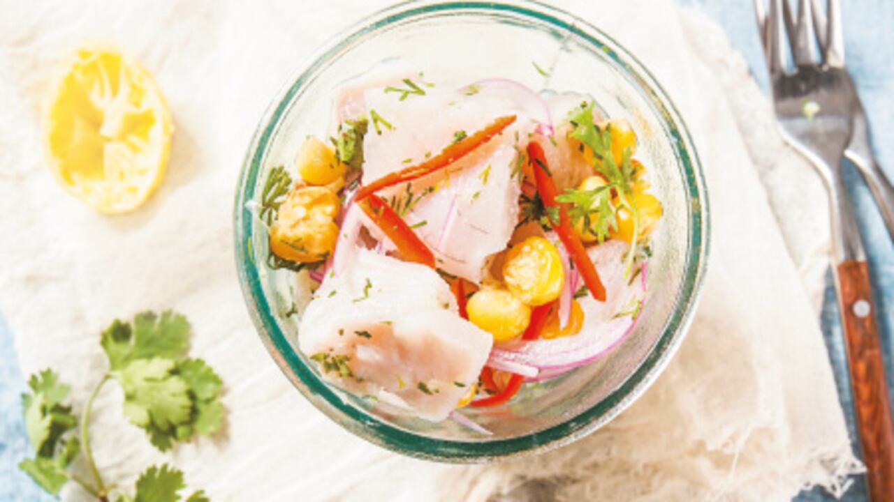 En un tazón de vidrio ponga la cebolla con el limón. Parta el ají por la mitad y retire las semillas y las venas. Corte en julianas muy delgadas. Parta el pescado en cubos y mezcle con la cebolla, el ají y el cilantro. Deje en la nevera por 10 minutos y revuelva (no deje más de 30 minutos). Mezcle con el maíz y sirva con tostadas o galletas de soda.
