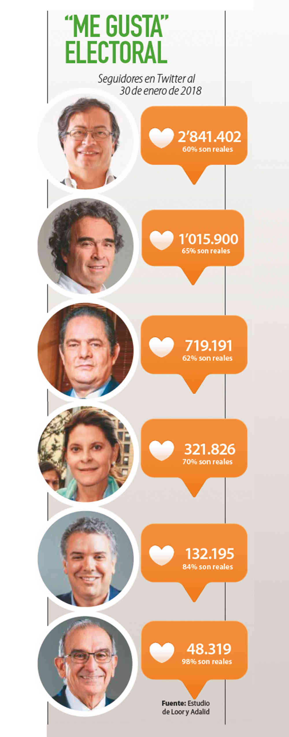 Recientemente, un estudio de las firmas Loor y Adalid identificó como “sospechosos” numerosos seguidores y comentarios en redes sociales de varios de los principales candidatos a la presidencia de Colombia.
