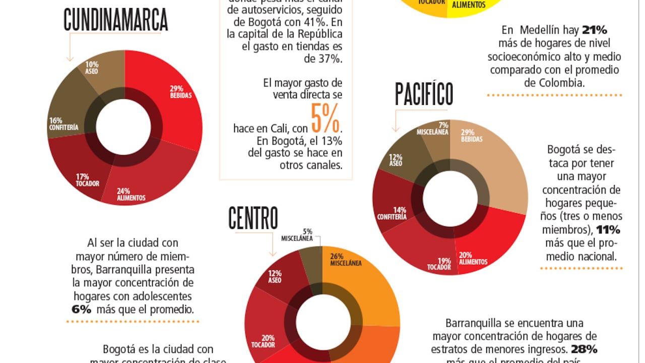 Los centros comerciales, las grandes superficies y marcas relevantes nacionales e internacionales están viendo con gran interés este desarrollo. Pero, ¿cómo es su consumo y qué particularidades tienen? Nielsen hizo para Dinero una radiografía del comportamiento del gasto de las canastas que mide, en las diferentes regiones del país, y de algunos rasgos claves de los consumidores en cada una de ellas.