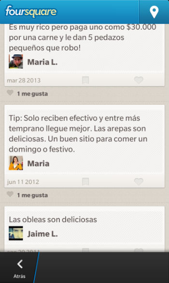 En vez de perder tiempo mientras va a un cajero, puede ubicar el restaurante en Foursquare y leer los tips de los usuarios en los que comparten sus experiencias y recomendaciones: