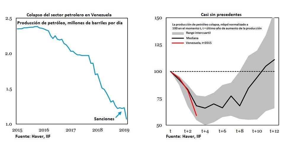 Luego de comparar el colapso del sector petrolero de Venezuela con un grupo de 21 casos similares registrados históricamente en otros países, donde la producción de petróleo cayó un 20% o más de manera acumulada al menos durante tres años, los expertos de IIF encontraron que si bien esta situación que enfrenta el vecino país tiene antecedentes, “es significativamente peor que otros episodios” y considera que a corto y mediano “es probable que las sanciones depriman aún más la producción de petróleo”.