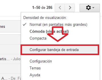 1. En su correo de Gmail busque el ícono del engranaje y seleccione la opción “Configurar la bandeja de entrada”: