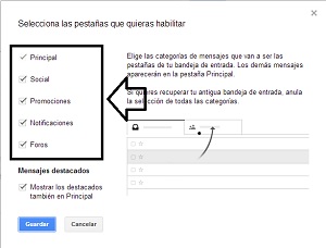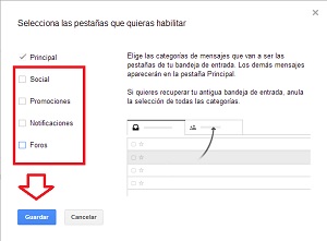2. Se desplegará una nueva ventana donde podrá seleccionar las pestañas que no quiera ver en su correo: