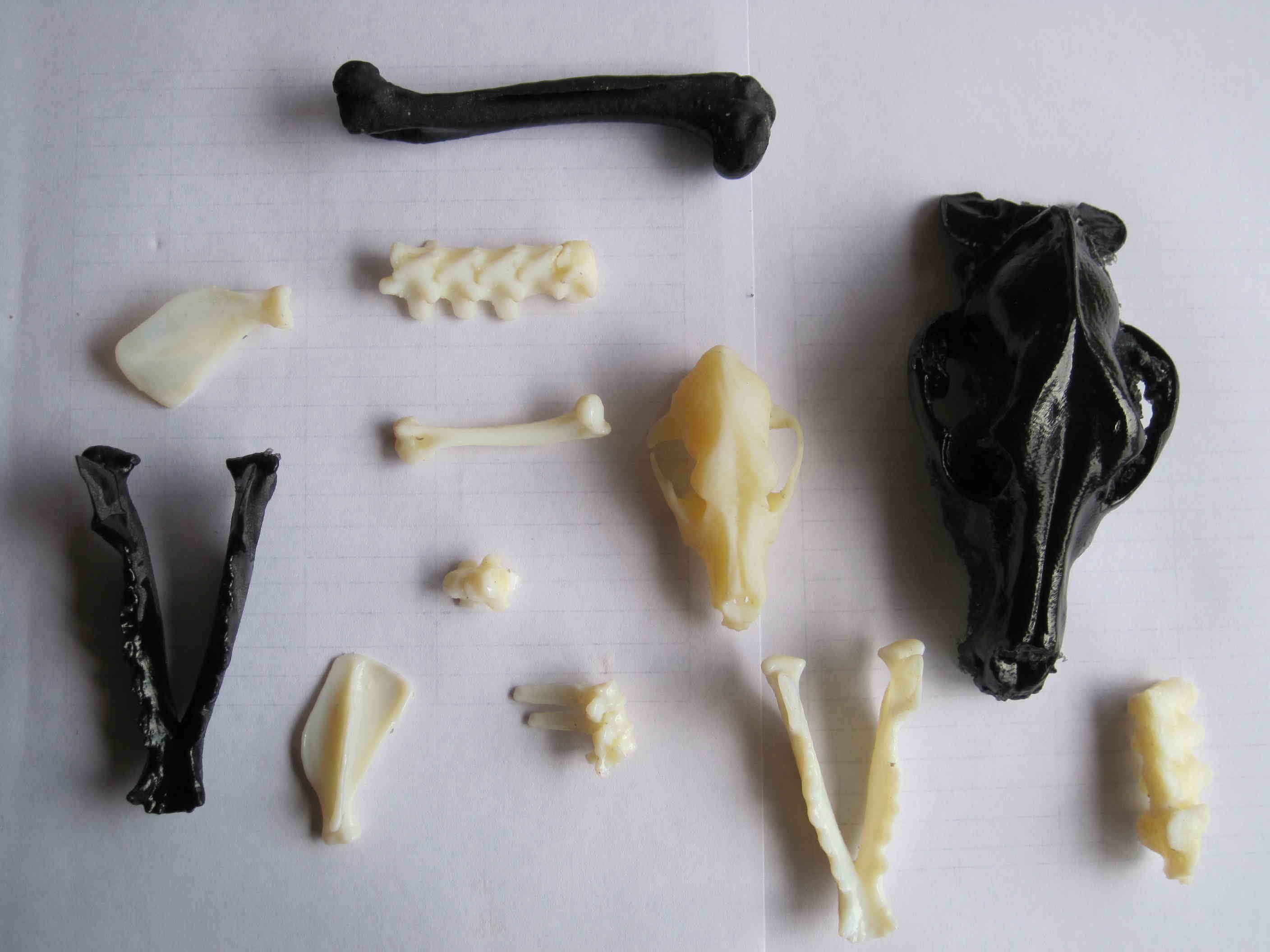 La pregunta obvia es cómo hacen los huesos y cuántos tienen. A la fecha, el equipo investigador cuenta con varios huesos, por ejemplo: cabeza, mandíbula, escápula y vertebras. Todos obtenidos por medio de la técnica de impresión 3D, son de color blanco, elaborados en un material llamado ABS que es un plástico maleable al calor, cada hueso tiene un peso aproximado de 20 a 50 gramos, ya que se puede imprimir en diferentes escalas.