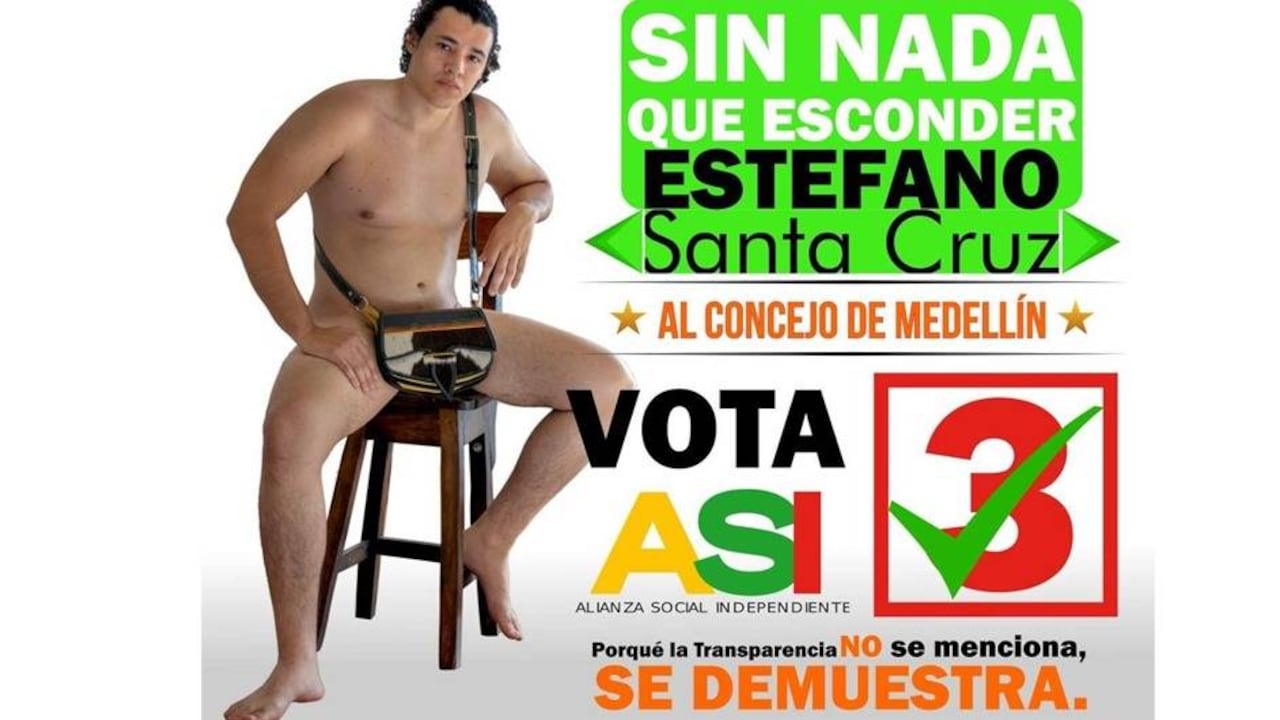 Empiezan las campañas políticas regionales y los candidatos buscan dar con la campaña más creativa, pero algunos cruzan esa línea. Es el caso de Estéfano Santa Cruz, politólogo de la Universidad de Antioquia, quien para su candidatura al Concejo de Medellín decidió desnudarse tapándose los genitales con un carriel jericoano. El desnudo está acompañado de un eslogan que dice “Sin nada que esconder” y se complementa con la frase “Porque la transpariencia no se menciona, se demuestra”. Santa Cruz es candidato por el movimiento Alianza Social Independiente (ASI) y él mismo fue quien publicó la imagen en sus redes sociales.