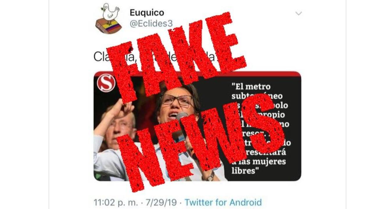 Este miércoles, en las redes sociales, empezó a ser compartida profusamente una pieza que simula haber sido publicada por SEMANA, en la que la imagen de la candidata por la Alcaldía de Bogotá Claudia López aparece acompañada del texto “El metro subterráneo es un símbolo fálico propio del machismo opresor. El metro elevado representará a las mujeres libres”.