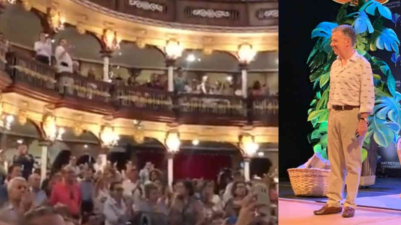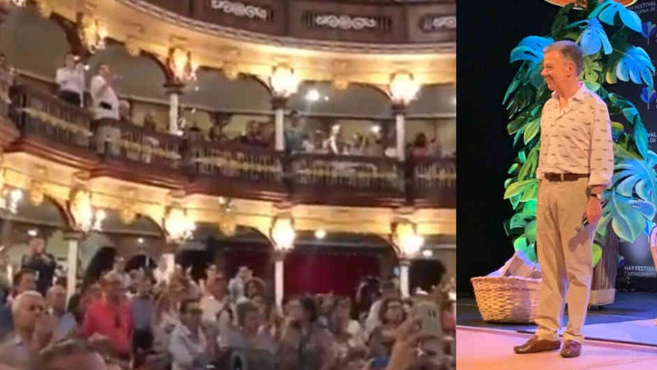 El primer día del Hay Festival, en Cartagena, dejó una escena para el recuerdo. El público del Teatro Adolfo Mejía recibió a Juan Manuel Santos con una ovación de casi un minuto a su llegada a la conferencia sobre la implementación del acuerdo de paz. Desde los balcones, los asistentes aplaudían y gritaban mensajes de reconocimiento a Santos, quien lucía impactado en el escenario. "En el fondo, a pesar de todo lo que está ocurriendo, la paz sigue avanzando -resaltó en su charla con Moises Naím-. Las disidencias de las Farc son, en porcentaje, menores que las disidencias que se han presentado en otros lugares del mundo". Esteban, hijo del exmandatario, grabó el momento de los aplausos, que se hizo viral.