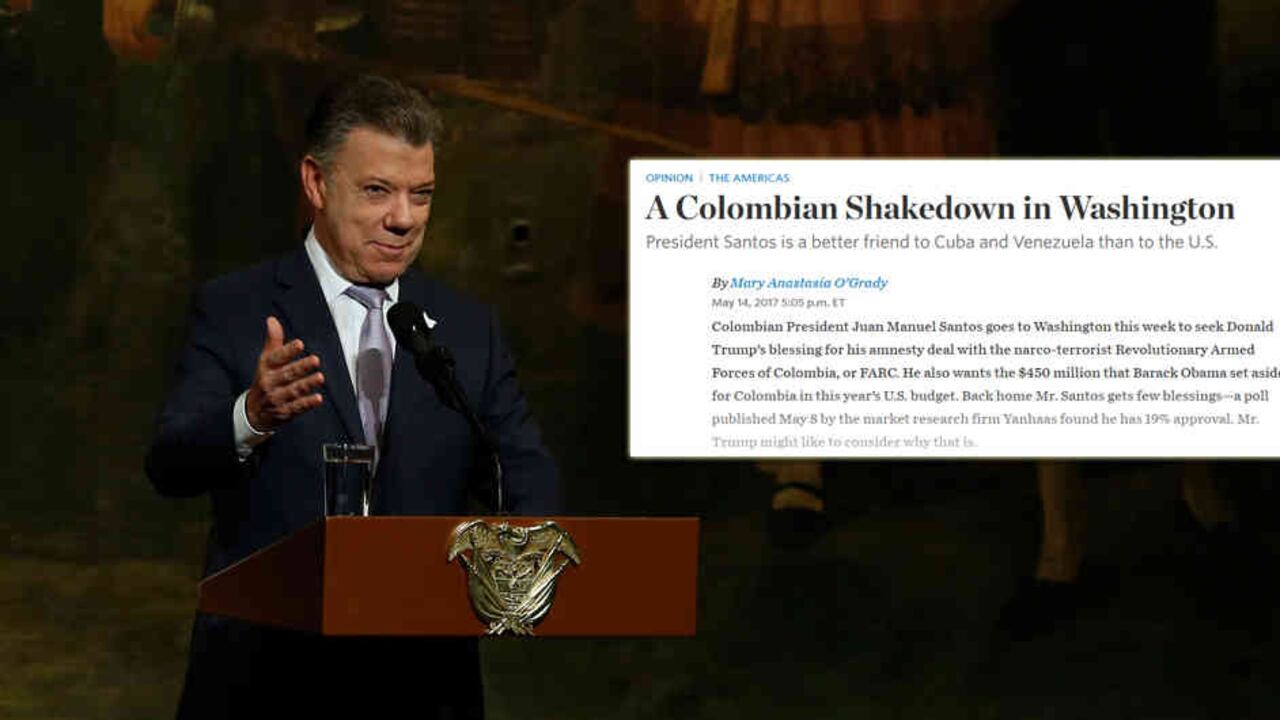 La columnista Mary Anastasia O’Grady, conocida por sus críticas posturas sobre el gobierno y el proceso de paz, escribió una dura editorial por cuenta de la visita de Santos a Washington para su cita con Trump. Dice que el presidente colombiano busca la "bendición" del magnate y los $ 450 millones que Barack Obama reservó para Colombia en el presupuesto, justo cuando su gobierno no va muy bien. Saca a relucir su bajo nivel de aprobación (19%), el escaso crecimiento de la economía (2%), el aumento del área cultivada de coca y lo acusa de poner el acuerdo de paz con las FARC por encima de la Constitución. Al final dice que "Colombia ya no es el aliado que estaba bajo el mando de Uribe", y que los "amigos de Santos son Cuba y Venezuela".