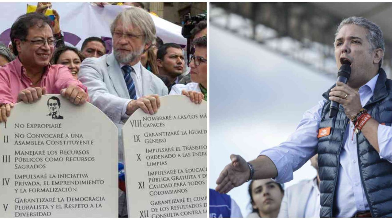 Durante la ceremonia en la que se selló el apoyo de Claudia López y Antanas Mockus con Gustavo Petro para la segunda vuelta presidencial, el candidato de la Colombia Humana presentó los 12 mandamientos que promete cumplir en caso de llegar al Palacio de Nariño escritos en dos piedras de marmol. La respuesta de Iván Duque no se hizo esperar y el candidato del Centro demócratico afirmó: “Yo no necesito firmar nada en mármol porque Santos firmó en mármol hace 8 años que no iba a subir los impuestos y ya sabemos lo que hizo. Yo no necesito firmar en mármol porque sobre mí no hay sospechas, porque sobre mí no hay temores, porque soy de una sola pieza, porque defiendo los valores y principios”.