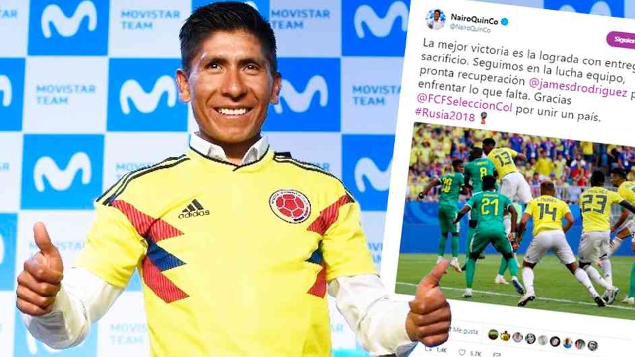 La clasificación de la Selección Colombia a octavos de final en el Mundial de Rusia puso a celebrar a todo el país. Miles de colombianos utilizaron las redes sociales para felicitar al equipo que venció 1 - 0 a Senegal con un gol de Yerry Mina. Uno de ellos fue el ciclista Nairo Quintana, fiel seguidor de la Selección, que aprovechó el momento para mandarle un mensaje al equipo colombiano, "gracias por unir a un país" dice el trino que publicó minutos después de conocer el resultado del encuentro.