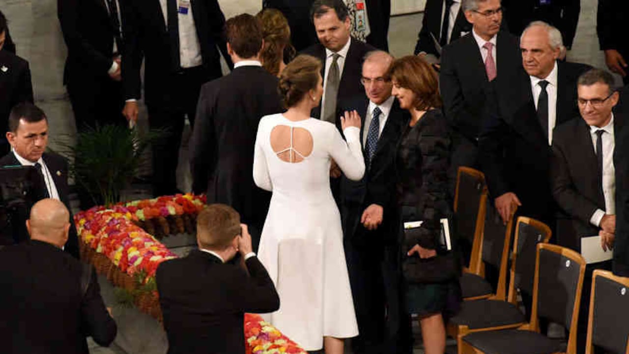 En la ceremonia de entrega del Premio Nobel de la Paz al presidente Santos, uno de los personajes que más llamaron la atención fue su esposa, Tutina. Sentada en primera fila, María Clemencia estuvo todo el tiempo sonriente al lado de sus tres hijos. La primera dama, que siempre se caracteriza por su estilo y su elegancia, sorprendió con un vestido blanco que tenía una abertura en la espalda. Adentro se veía el símbolo de la paz, el mismo que está inspirado en la pata de una paloma popularizado en la década de los 1960. El traje fue diseñado por el colombiano Esteban Cortázar.