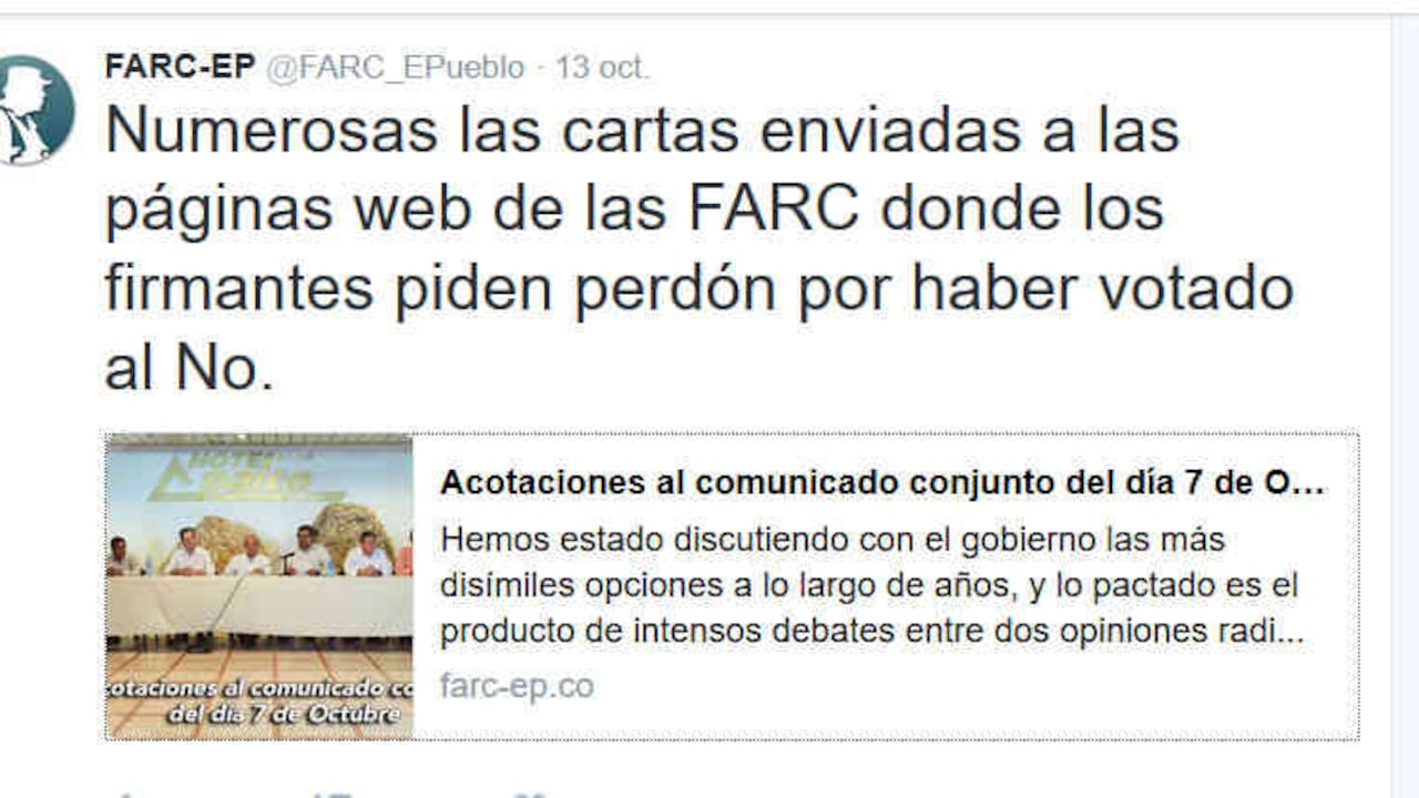 Después de que el No fue mayoría en el plebiscito por la paz, miles de personas han salido a las calles a pedir que se llegue a un acuerdo pronto que pueda dar fin al conflicto. Las FARC han enviado múltiples comunicados, trinos y videos estos días para responder a esas manifestaciones. En uno de sus mensajes, sin embargo, sorprendieron con un dato. A su página web han llegado decenas de cartas de votantes del No "pidiendo perdón" y alegando que su "intención nunca fue apoyar a Uribe, sino expresar su desacuerdo sobre algún punto específico".