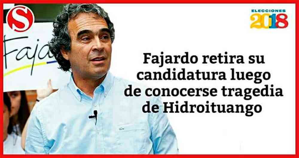 En el último tramo de la carrera por la Casa de Nariño las fake news (o noticias falsas) no se hacen esperar. Esta vez, quien cayó en las garras de la mentira fue Sergio Fajardo. La imagen que circula por redes sociales señala que el candidato “retira su candidatura luego de conocerse tragedia de Hidroituango”, lo que no es cierto de ninguna manera. La foto se le atribuye a esta revista, que en ningún momento publicó información semejante.