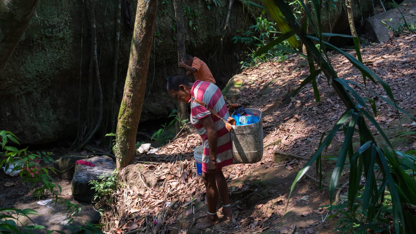 Del único caño que tienen cerca, los nukak recogen agua para beber, lavar la ropa, cocinar y otras necesidades básicas. © Martina Jiménez G.
