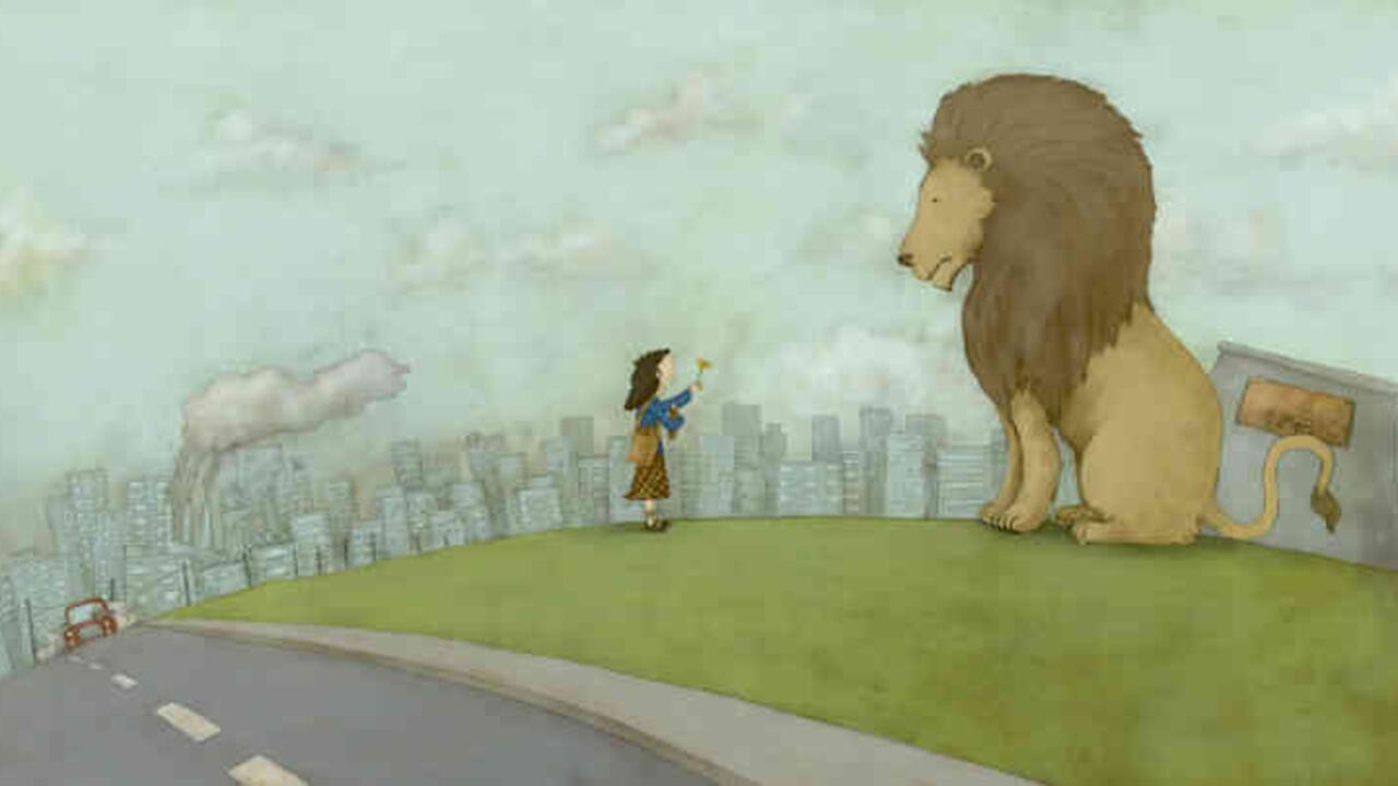 Si uno ve esta imagen, hay un pedestal atrás que dice 1948, y en una imagen posterior del libro uno ve al fondo ese mismo pedestal, pero con el león. Ahí jugamos con la imaginación de la niña, que busca fuerza en un león de escultura. Ella se lo lleva, se lo apropia. Así, en los cambios, decidimos por consejo de la editora volver al león más abrazable.