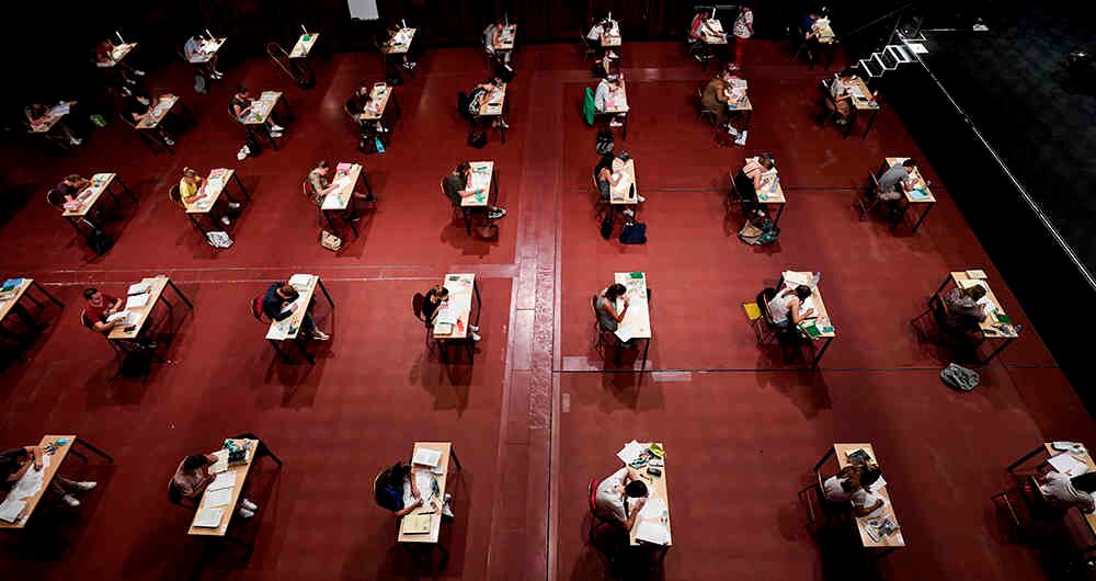 Universitarios presentan sus exámenes en la sala de conciertos Ancienne Belgique para mantener el distanciamiento social. Bruselas, Bélgica. // AFP/Kenzo Triboullard.