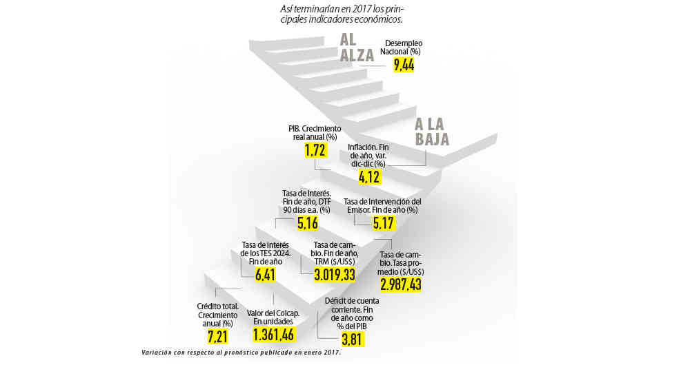 El regreso al rango meta de la inflación y las mejoras en infraestructura. La resiliencia de la economía que, si bien crece poco, no entró en recesión a pesar de la gravedad del choque de precios del petróleo. Reducción de la inflación, las tasas de interés y del déficit de cuenta corriente. El sector de servicios, en general, y en especial el turismo y los servicios profesionales, así como el agro. Los inversionistas extranjeros, quienes siguen manteniendo sus flujos en el mercado colombiano. La resiliencia de los precios de vivienda que, a pesar de la mala situación económica, se han sostenido. La baja volatilidad de la tasa de cambio durante 2017.