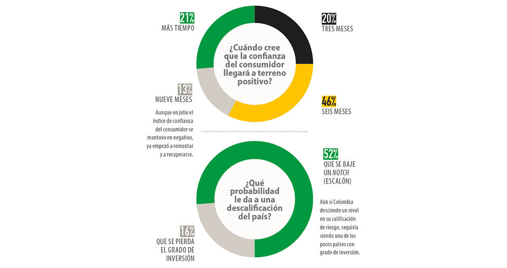 “Es importante dejar atrás el pesimismo, pues posiblemente ya tocamos fondo. La economía sufrió el impacto de la caída en el precio del petróleo y salió bien librada para la magnitud del choque. Es momento de apostarle nuevamente al país. Es importante tener en cuenta el futuro político, pero no desacelerar el paso de inversión por la pasión política o por eventos que no se han cumplido”, opinan en Protección, mientras que en Valora Inversiones creen que la clave está en destrabar las obras 4G, proteger la inversión extranjera y enfocada en sectores estratégicos como minería e hidrocarburos, “pues las consultas de comunidades están frenando en seco dicha inversión”.
