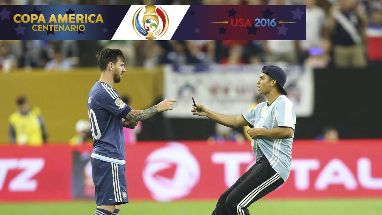 Cuando iba a comenzar el segundo tiempo entre Argentina y Estados Unidos, un fanático hizo de las suyas para entrar al campo de juego y abrazar a su ídolo.