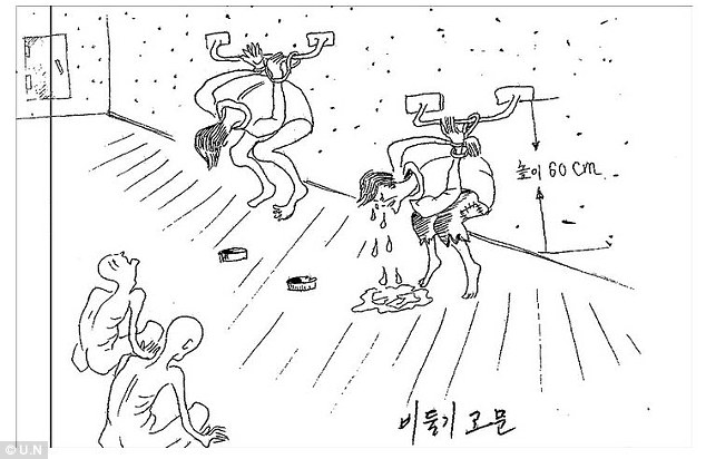 En este dibujo presentado por la ONU, un exguardia no identificado relató que "en esta posición, llamada 'la tortura de la paloma', los prisioneros son golpeados en el pecho hasta que vomitan sangre". Foto: ONU.