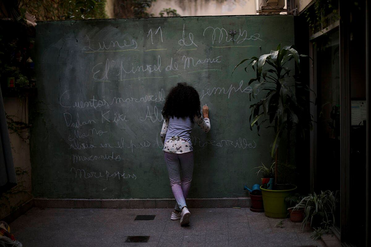 Odara Luna Farmetano utiliza una pared en su casa como pizarra, durante el bloqueo ordenado por el Gobierno con el fin de frenar la propagación del covid-19, en Buenos Aires, Argentina, el 11 de mayo. El país latinoamericano registra 7.121 casos de contagio. Foto: Natacha Pisarenko/ AP.