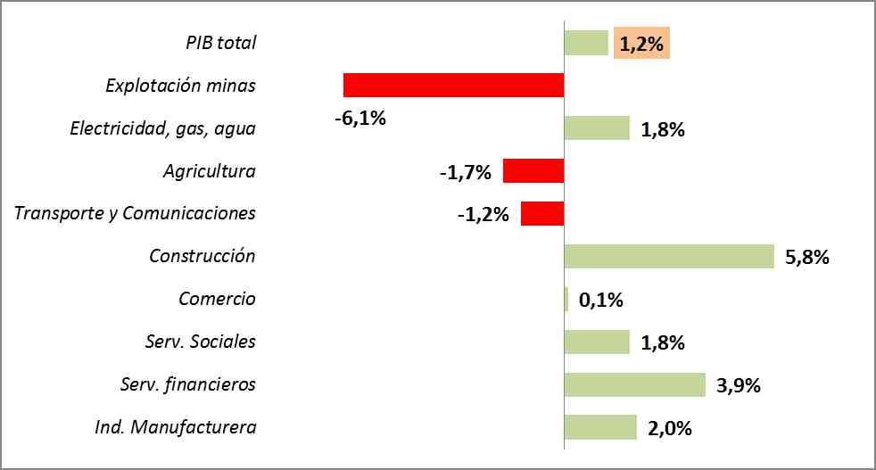 Por otro lado, cabe destacar el buen desempeño de la construcción, los establecimientos financieros y la industria manufacturera, los cuales han tenido un crecimiento anual de 5,8%, 3,9% y 2% respectivamente.