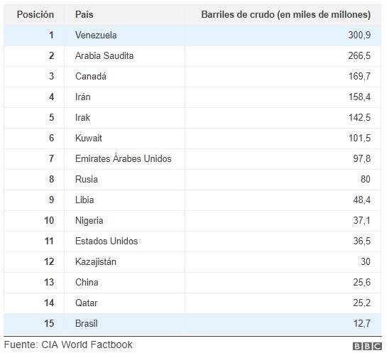 Venezuela es, por excelencia, el país con las mayores reservas de petróleo del mundo. Tiene hasta 309.000 millones de barriles de petróleo, de acuerdo información estadística de la Central de Inteligencia de Estados Unidos (CIA).