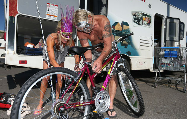 Karen Carner y su esposo, Mark Lee, mientras decoran una bicicleta el pasado 26 de agosto, en un almacén de Wal-Mart en Reno, Nevada. La pareja proporciona un servicio de conserjería para dos mujeres de Pittsburgh que son primerizas en el festival. Foto: AP.