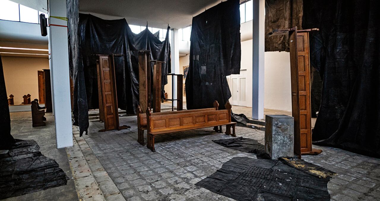 No hay orden, no hay recorrido en este abordaje casi total al Museo de la Universidad Nacional titulado ‘Condiciones aún por titular’, pero en su espacio principal sí es inmediata la sensación del cacheteo. El piso, como si hubiera pasado un huracán, no es solo accesorio en una sensación de escombros literales y vacío. Las bancas incompletas de iglesias, desmembradas, muchas dentro de este espacio, esto mientras otras afuera les dan la bienvenida a los espectadores cargando bloques de piedra encima que las doblega.