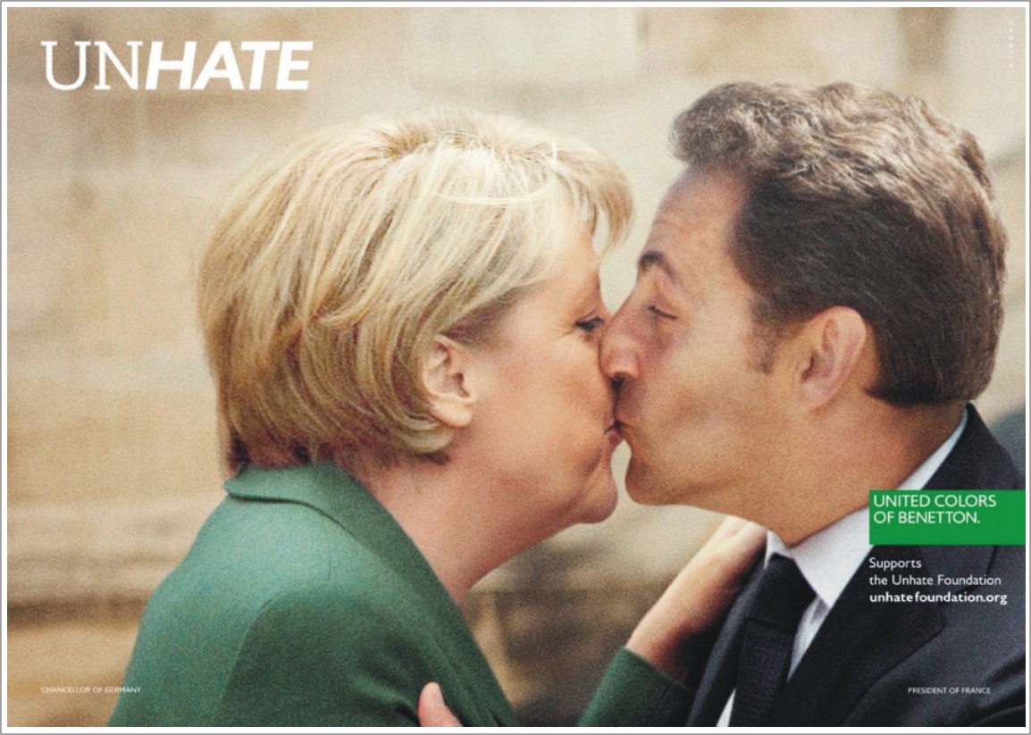Esta campaña de Benetton lanzada en 2011 causó sensación, pues mostraba unos montajes de primeros mandatarios opositores besándose en la boca como un gesto de paz y reconciliación. Tal fue el caso de Barack Obama y Hugo Chávez, o de Angela Merkel con Nicolas Sarkozy. También apareció el papa de aquella época, Benedicto XVI, besándose con Ahmed el-Tayeb, el Gran Imán de al-Azhar. Un mensaje lleno de muchos condimentos y no apto para todos los gustos. De hecho, varios de los avisos fueron censurados.