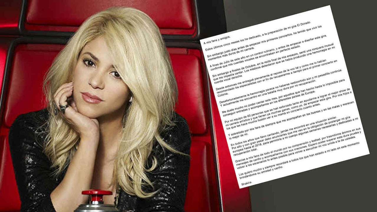 La razón se debe a que la cantante tiene un problema en sus cuerdas vocales que le impide interpretar sus canciones como siempre lo ha hecho. "A finales de julio de este año en un control rutinario, y antes de empezar a diseñar esta gira, confirmé que mis cuerdas vocales se encontraban en perfecto estado", escribió Shakira.