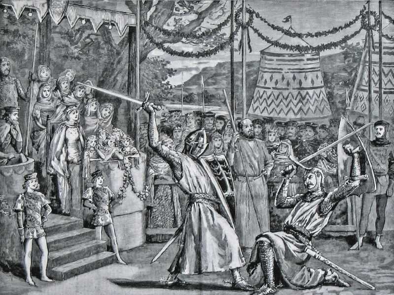 Las primeras novelas históricas que se escribieron fueron las del escocés Walter Scott. Esta es una ilustración de una escena de ‘Ivanhoe’ (1819), su libro más conocido, que se publicó en ‘The Graphic’, un periódico del Reino Unido que cerró en 1932. La historia, ambientada en la Inglaterra medieval, narra las aventuras de Wilfredo de Ivanhoe, un valiente caballero.