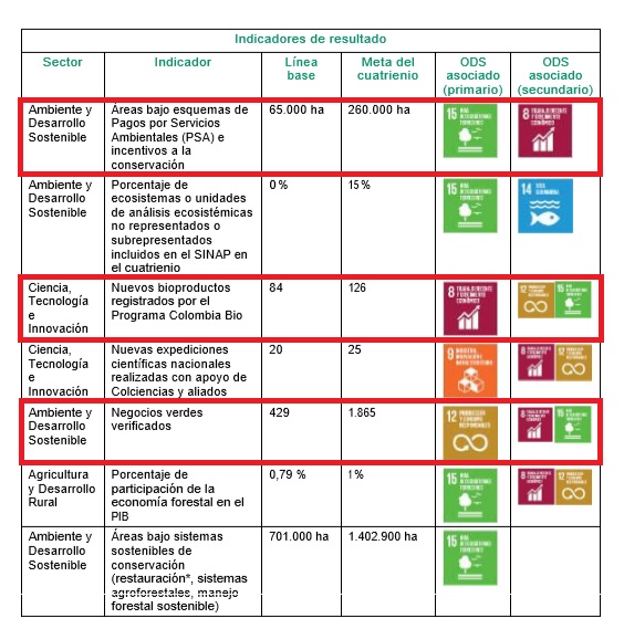 El cuarto capítulo del Plan Nacional de Desarrollo (PND) 2018 - 2022 se titula ‘Pacto por la sostenibilidad: producir conservando y conservar produciendo’ y define cuáles son las metas para alcanzar “un equilibrio entre la conservación y la producción, de forma tal que la riqueza natural del país sea apropiada como un activo estratégico de la Nación”. Para esto crean cuatro líneas con sus respectivos indicadores: