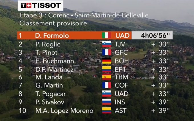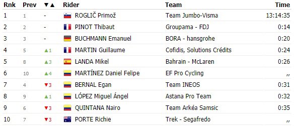 El colombiano Daniel Martínez atacó en el grupo de favoritos, pero fue capturado por Roglic, que logró el segundo puesto en la jornada y amplió su ventaja frente a Egan Bernal y Nairo Quintana, estos dos corredores llegaron con un retraso frente al esloveno.