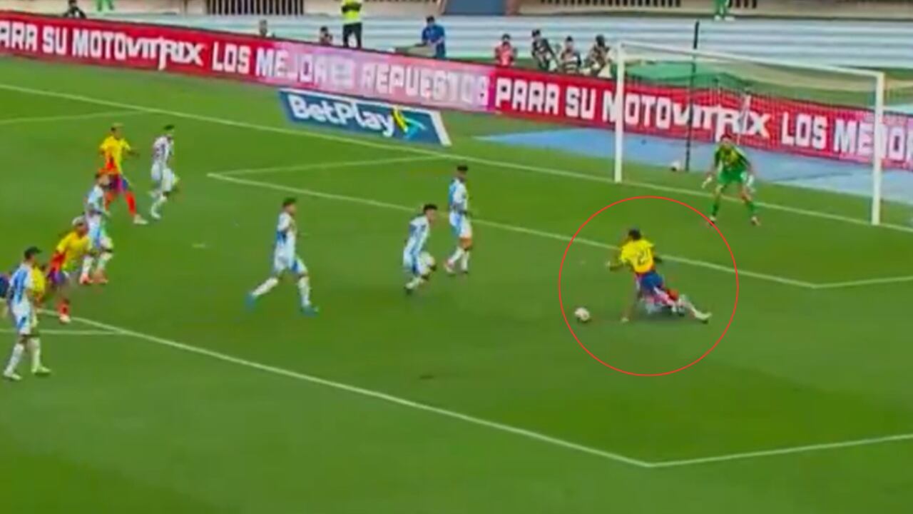 Justamente, esta jugada terminó decretándose como penal, que aún genera malestar entre los albicelestes. En una acción algo confusa, se ve cómo la pierna del defensor cruza al lateral colombiano, derribándolo dentro del área.