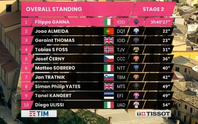 En la clasificación general no hubo cambios importantes y en el liderato sigue Filippo Ganna, que conservó la maglia rosa llegando en el pelotón principal. El mejor colombiano es Éiner Rubio a 3′02′' del italiano.