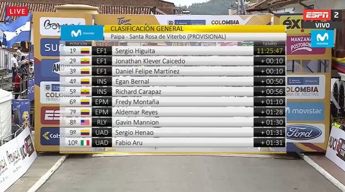 Gracias a su triunfo, Higuita asumió el liderato de la carrera, que le correspondió a su compañero Jonathan Caicedo en las primeras tres jornadas.