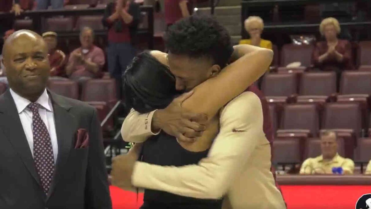 La ceremonia de Angola en su alma máter ha llamado la atención de todos los seguidores del deporte en los Estados Unidos. Cuando el jugador recibíauna camiseta enmarcada con su nombre y su número en la escena entró su madre que lo sorprendió con su presencia en su partido final.