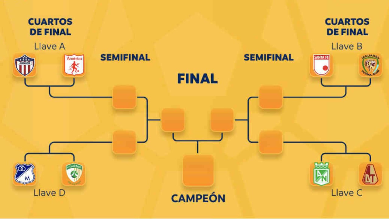 Se anticipa que este lunes se den a conocer las fechas y los horarios de cada uno de los encuentros. Así quedó organizada la llave del campeonato que en su fase semifinal se enfrentará el ganador de Junior vs. América con el Millonarios vs. Equidad. Mientras que los que se impongan entre Santa Fe y Jaguares y Nacional Tolima se medirán en la otra semifinal.