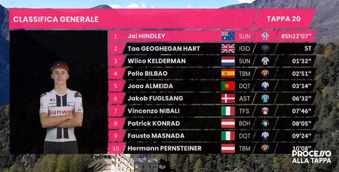 El ganador de la etapa fue Tao Geoghegan Hart, del equipo Ineos, quien se impuso en un duro cierre frente a Jai Hindley. El corredor del Sunweb le quitó el liderato a su compañero, el holandés Wilco Kelderman, que llegó junto con Rubio. El colombiano fue sexto en la jornada.