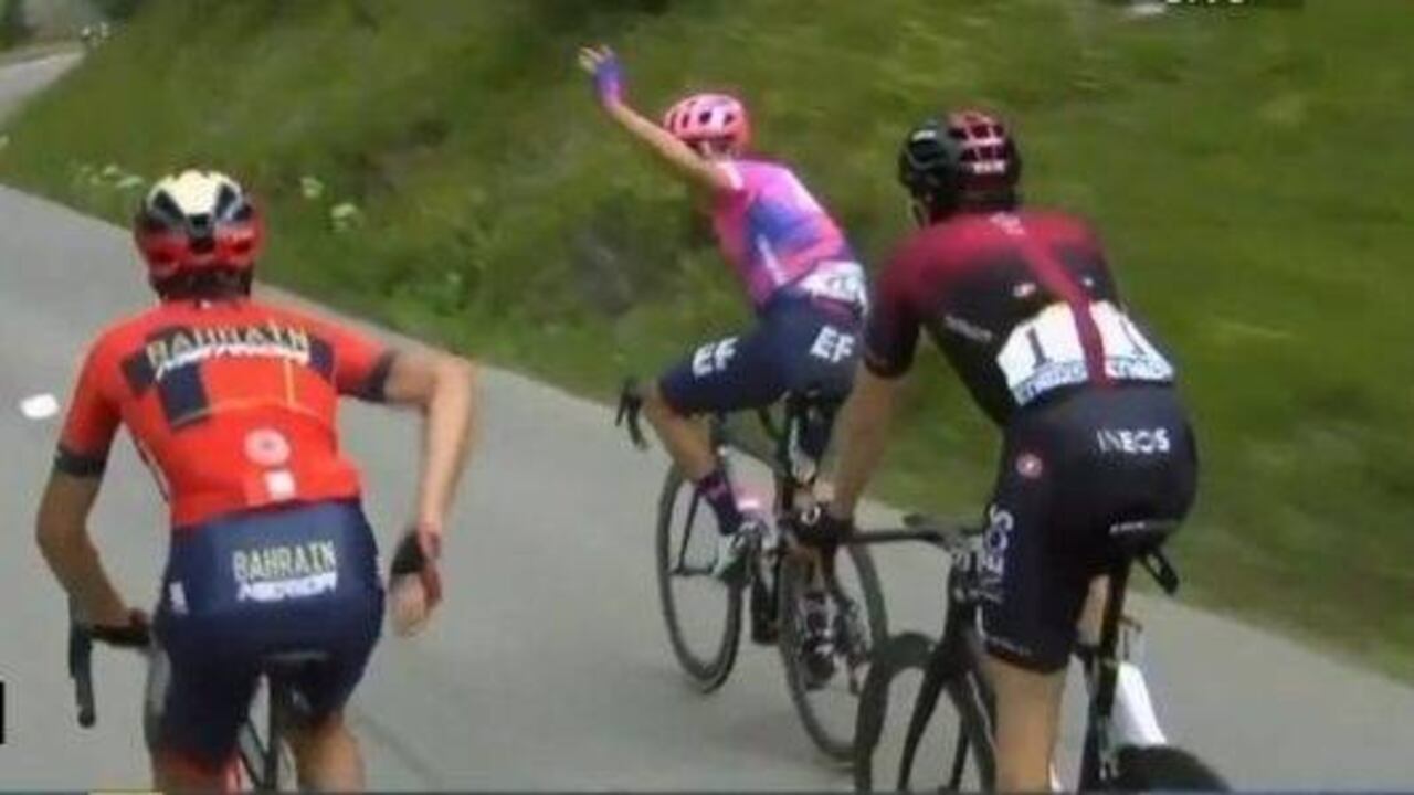 El grupo fue frenando su paso cuando Rigo tuvo un fuerte alegato con Vincenzo Nibali. El italiano le pedía calma mientras que el antioqueño exigía que siguieran adelante en la persecución de Egan Bernal.