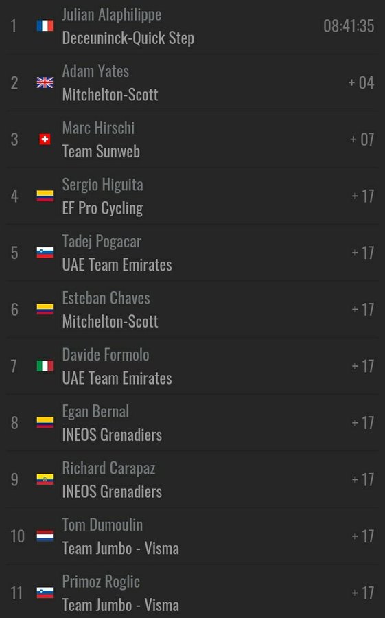 En el top 10 de la clasificación general ya hay 3 colombianos. Huiguita es cuarto, Chaves es sexto y Egan es octavo, todos a 17 segundos del nuevo líder. Nairo, Rigo y Superman López tienen el mismo tiempo que sus compatriotas.