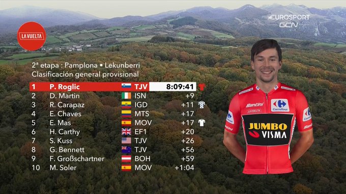 Por detrás, Dan Martin arrebató el segundo puesto de la general al ecuatoriano Richard Carapaz, que se queda tercero. El corredor del Team Ineos arriesgó con un ataque en terreno llano antes de la última escalada del día, que fue controlado por el Movistar, el equipo que más trabajó al frente del grupo a lo largo del día.