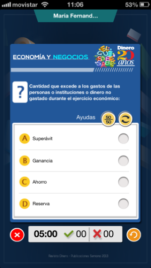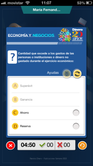 Usted tendrá ayudas de las que podrá hacer uso sólo una vez en cada juego. Estas ayudas son: 50/50 o cambio de pregunta, en caso de que no tenga ni idea de la respuesta de la pregunta que se le está haciendo.