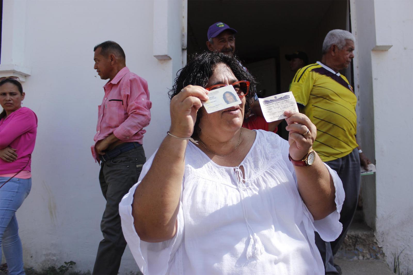 | Soraya Bayuelo muestra su cédula y su certificado de votación a la salida de las urnas.