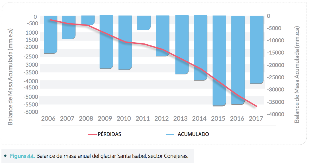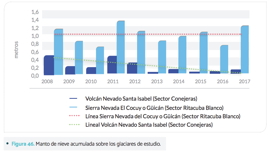 La fusión glaciar sigue avanzando con rapidez, y en el país tiene una fuerte relación con el más reciente fenómeno extremo de variabilidad climática: El Niño que padecimos entre 2015 y 2016. Hace 50 años, Colombia tenía 213 kilómetros cuadrados de hielo en sus cordilleras, para un total de seis glaciares. Hoy apenas tiene 37 kilómetros cuadrados. Uno de los casos más tristes es el del volcán Nevado Santa Isabel, que viene perdiendo masa sin interrupción desde 2006, y ha reducido en un 40% durante los últimos dos años.