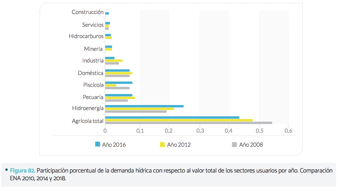 Del total de 37 millones de metros cúbicos que consume colombia, la demanda hídrica del sector agricultura es del 43,1%, un poco menos que hace una década, cuando sobrepasaba el 50%. Pero sigue siendo el primer renglón.