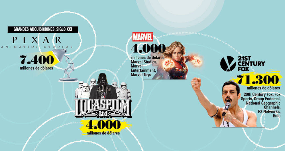 En 2012, Disney puso su foco en Lucasfilms. Por esta productora, que George Lucas fundó y cimentó con el éxito de su saga espacial Star Wars (entonces la más taquillera de la historia), pagó otros 4.000 millones de dólares. A diferencia de las cintas de Marvel, en su gran mayoría muy bien recibidas, las producciones que Disney ha lanzado de La guerra de las galaxias han suscitado muchísimas críticas. Esto no sorprende si se considera que los seguidores llegan a extremos religiosos, y hasta el mismo creador de la saga recibió garrote cuando estrenó nuevos episodios entre 1999 y 2005. Sin embargo, la inversión sin duda se ha justificado: Disney ya la recuperó e hizo 800 millones extras. Para este diciembre tiene anunciado estrenar Episodio IX.