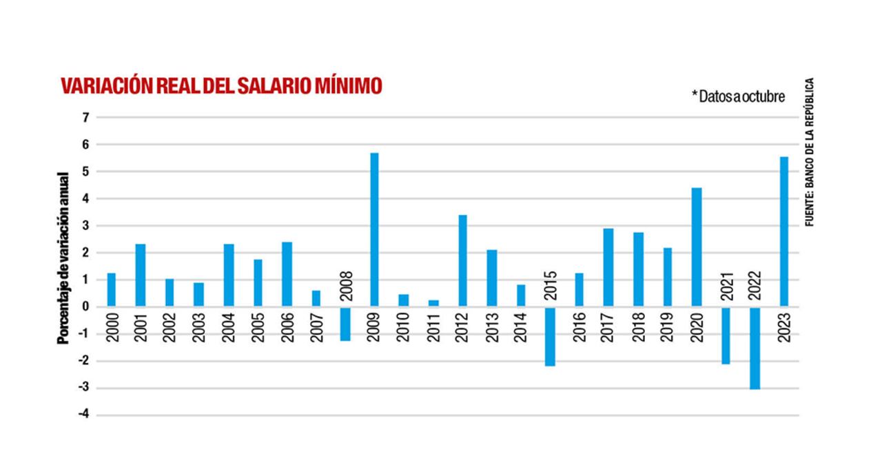 De hecho, la consultora Oxford Economics considera que uno de los riesgos para que la inflación no baje en 2024 al ritmo que requiere el país es el ajuste del salario mínimo, el cual, en la década previa a la pandemia, subió en promedio 1,6 % real (descontado la inflación) y después de la crisis sanitaria ha tenido un alza real de 3,4 %.